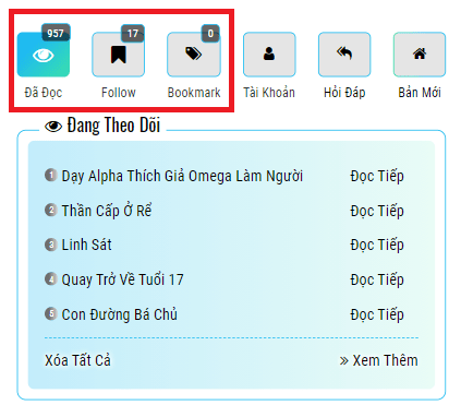 Những dữ liệu được lưu vào trình duyệt: Truyện Đã Đọc, Bookmark. Các bạn có thể thấy những dữ liệu này tại trang chủ