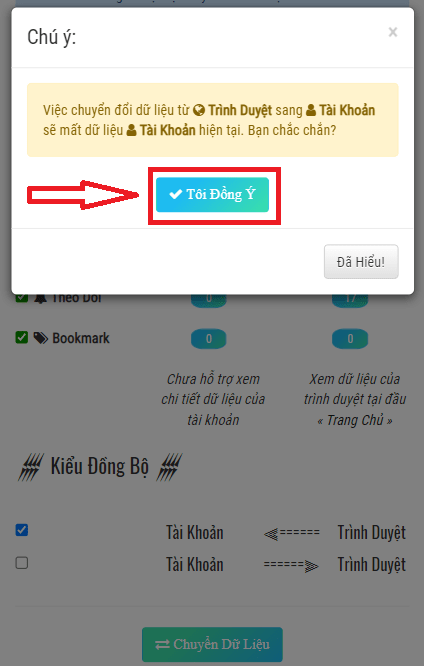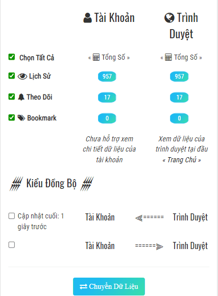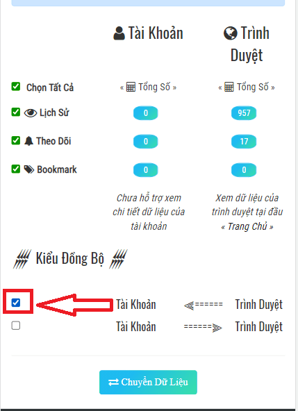Chọn mục chuyển từ Trình Duyệt sang Tài Khoản (Tích vào ô đầu tiên) Sau đó Chuyển Đổi Dữ Liệu.